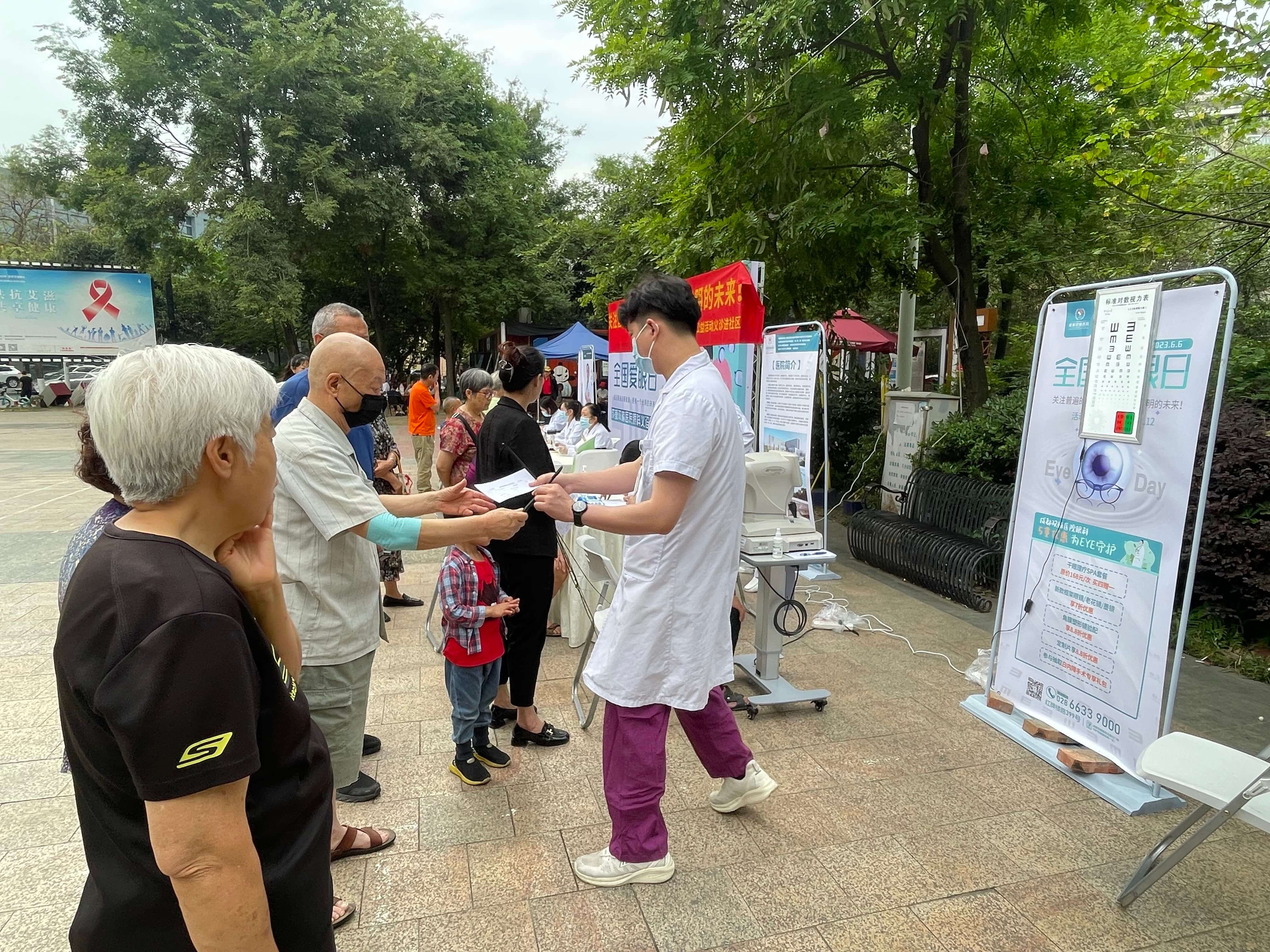 在第28个全国“全国爱眼日”来临之际,为更好地传递爱眼护眼健康理念和服务群众。昨天(6月6日)上午,成都双楠眼科医护人员在武侯区赞花广场开展以“关注普遍的眼健康,拥有一个光明的未来”为主题的健康义诊志愿服务活动。